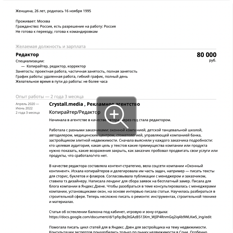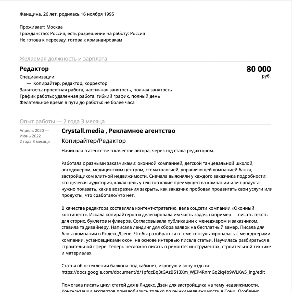 Аракс хотела попасть в банковскую сферу — и пробовала устроиться на Московскую Биржу, в Альфа-Банк, РНКБ Банк, ХоумКредит Банк и другие банки. Мы вместе делали тестовые задания, обновляли резюме и собирали портфолио именно под банки. Через месяц Аракс пригласили в Сбер и Правительство Москвы, а еще через неделю ей предложили позицию редактора в Тинькофф Банке на неполный день. С марта Аракс работает на окладе в 115 000 тысяч.