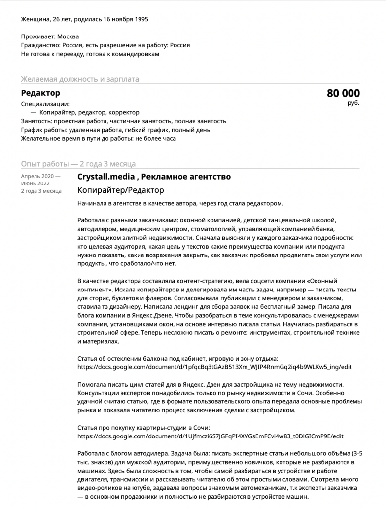 Ирина, 26 лет, работала в бьюти-услугах, сейчас — автор в агентстве АКМ Стратегия. Вот её резюме — все проекты она делала во время обучения.